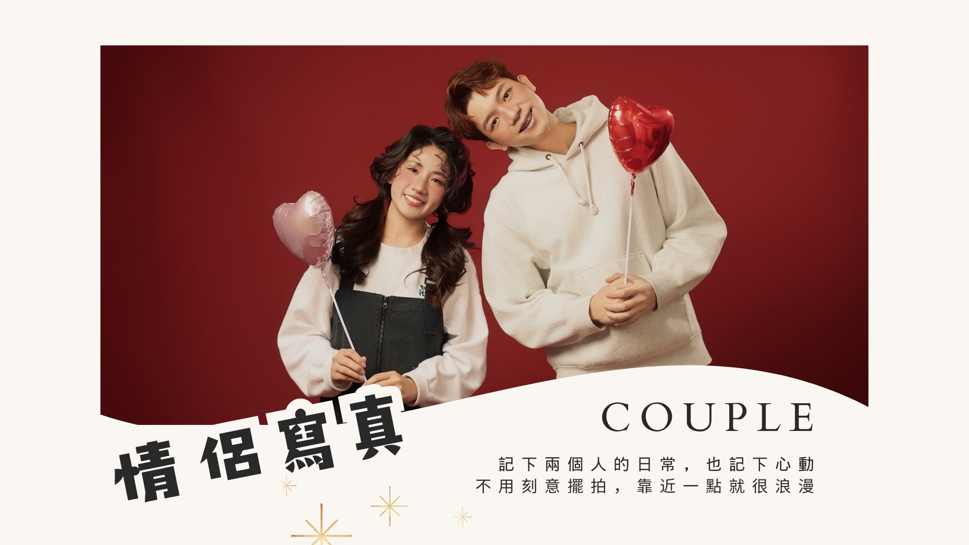 A:建議以「精神感」為主:底妝乾淨、眉眼清楚、髮絲不遮眼,畫面會更俐落耐看。我們的情侶寫真方案皆含 1 位造型服務(可由你們指定最需要的一位);若希望加購另一位造型,建議在預約前先告訴我們,方便安排造型師與時間,讓兩人的整體風格更一致。